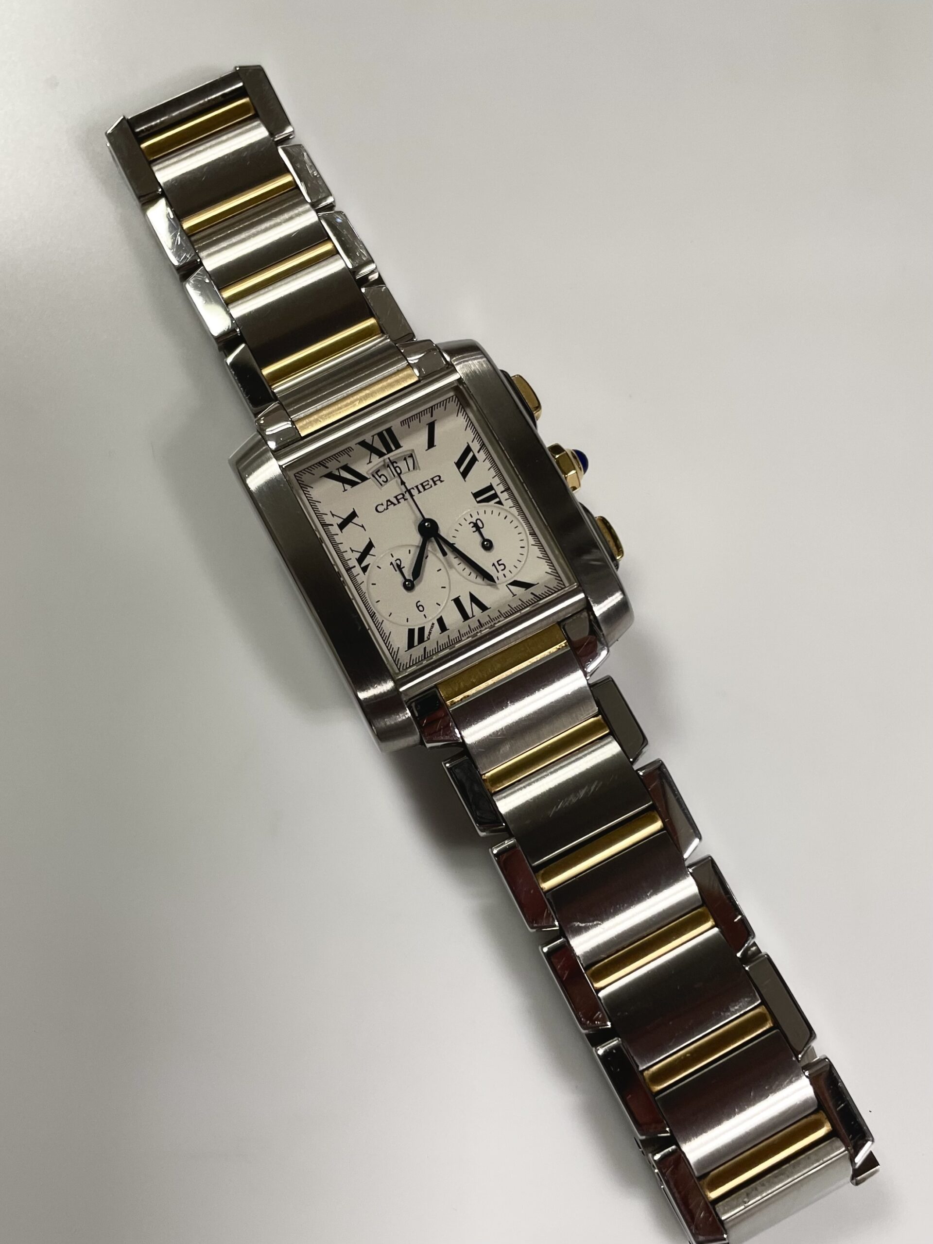 クオーツモデルの場合、長年の使用で磁気を帯びてしまい、それが原因で「止まり」や「進み」が発生することがよくあります。バッグの留め具やスマートフォンの近くに置くと磁気帯びしやすいので注意が必要です。また、タンクフランセーズのブレスレットは構造が緻密で汚れが溜まりやすく、放置するとピンが腐食して抜け落ちてしまうことがあります。オーバーホールの際には、超音波洗浄でブレスレットの隙間の汚れも徹底的に落とすことで、トラブルを未然に防ぐことができます。