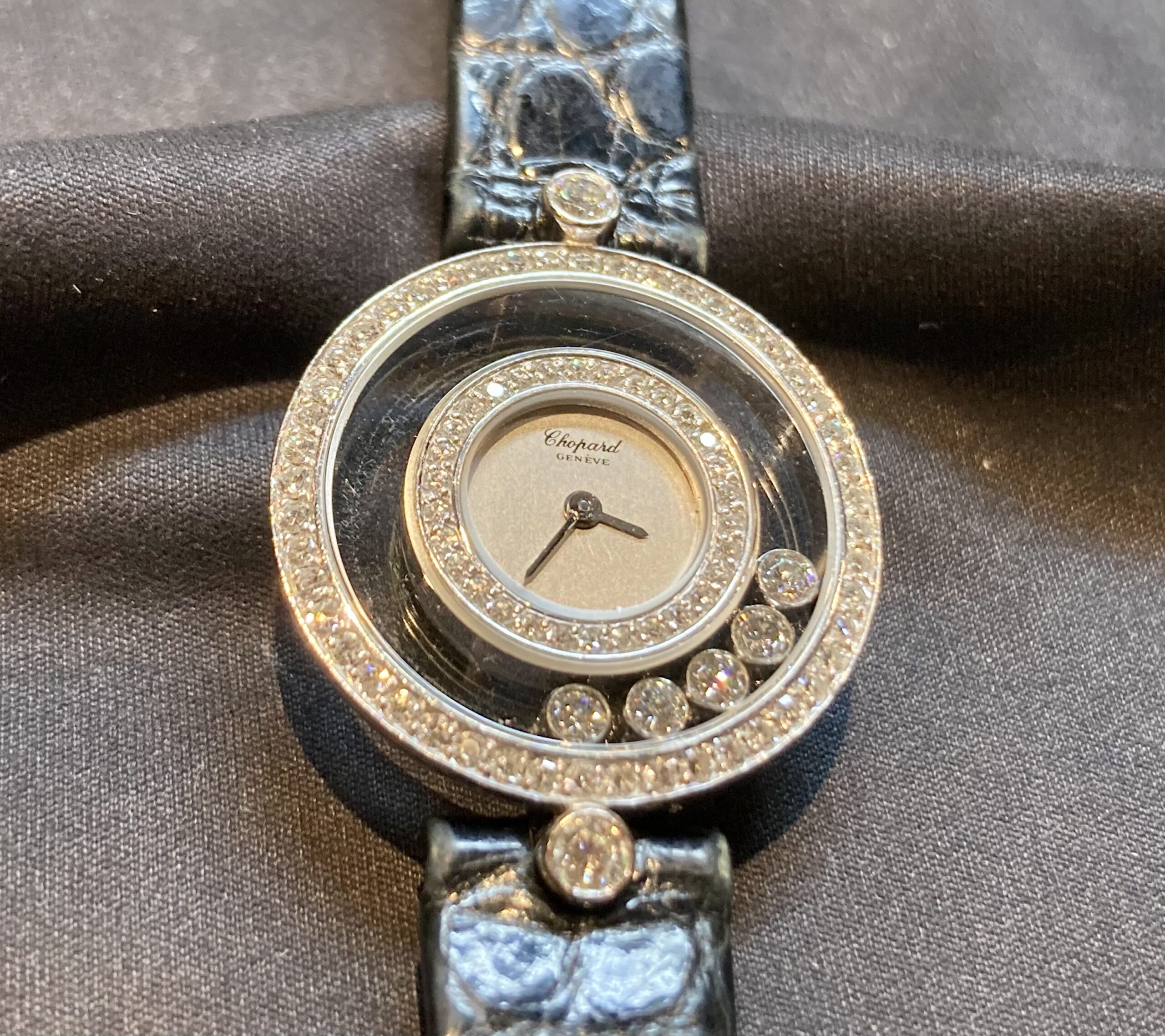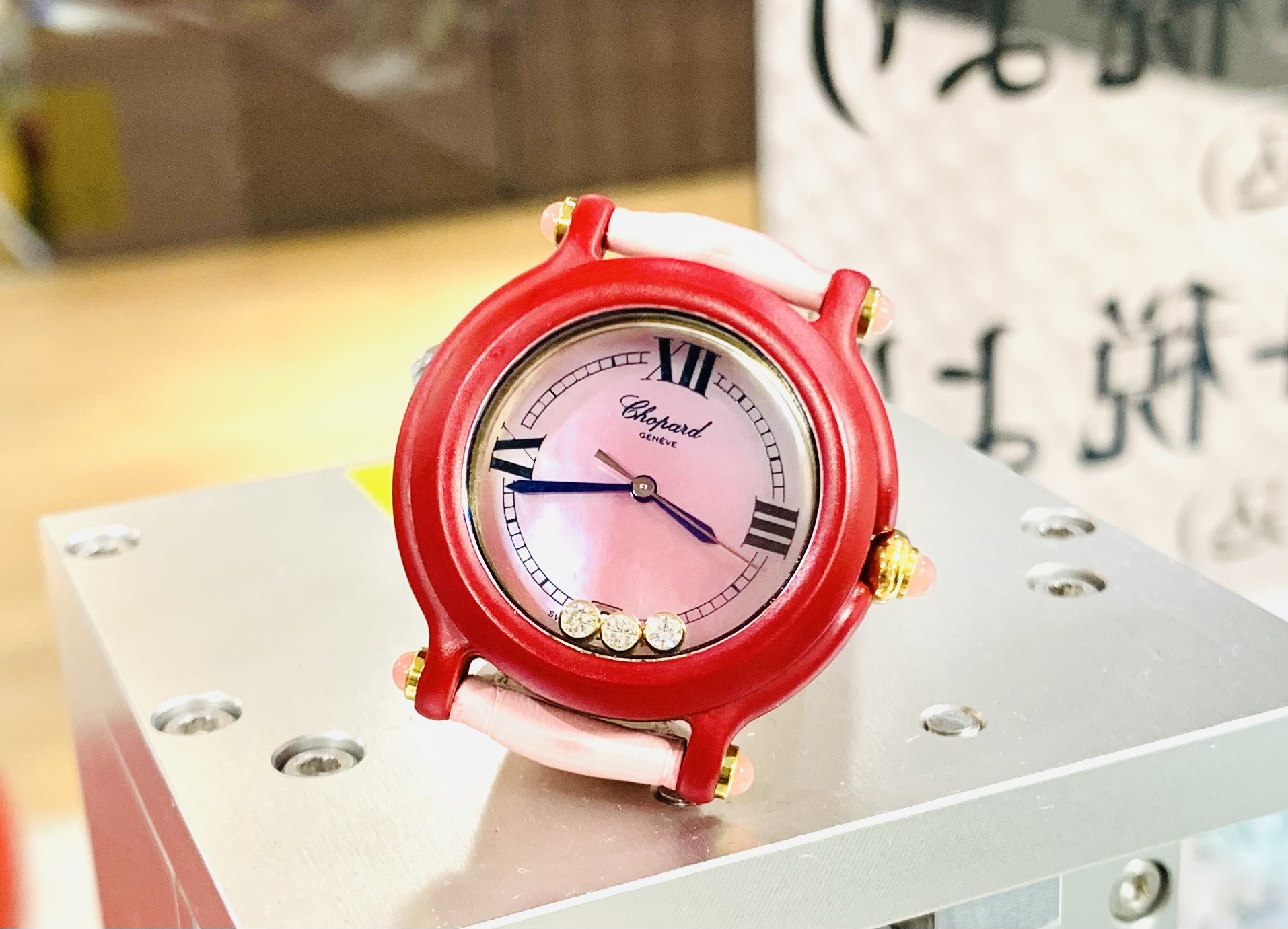 ショパールのアイコンとも言える「ハッピーダイヤモンド」は、2枚のサファイアガラスの間にダイヤモンドを封入し、文字盤の上で自由に動く構造が最大の特徴です。このモデルの電池交換やメンテナンスは、通常の時計よりもさらに慎重に行う必要があります。