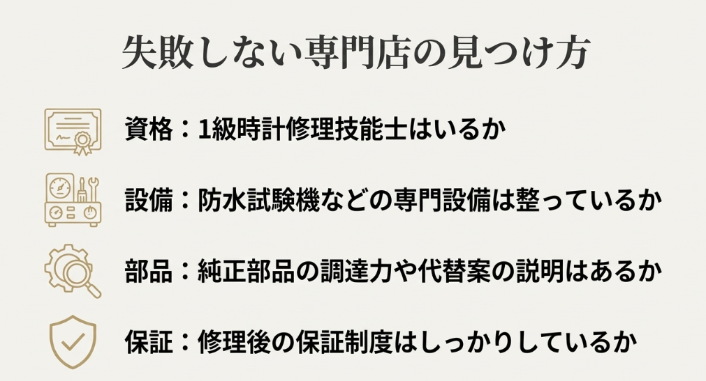 ここまで民間修理店のメリットをお伝えしてきましたが、全ての店舗がショパールのような高級時計を扱える技術レベルを持っているわけではありません。大切な時計を預けるにあたって、失敗しない店舗選びの具体的なポイントをお伝えします。