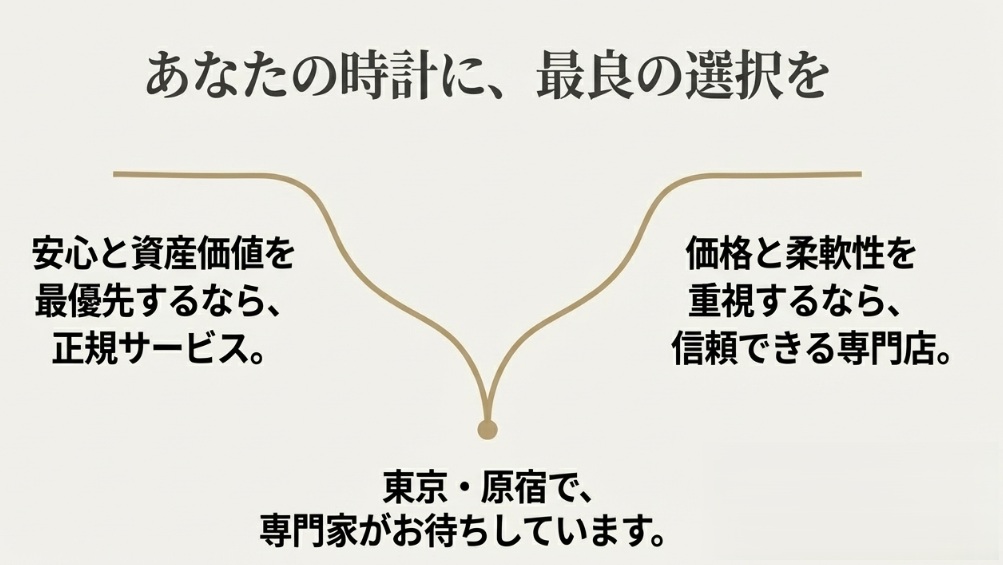時計のメンテナンスにおける「正規サービス」と「民間修理専門店」という2つの選択肢を提示するスライド。