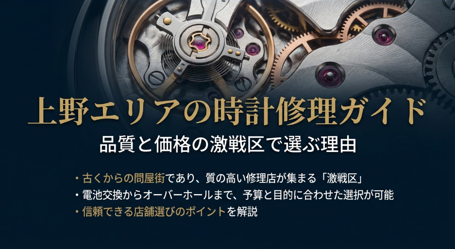 こんにちは。はらじゅく時計宝石修理研究所、店長の天野一啓です。上野エリアで大切な時計のメンテナンスができる場所をお探しですね。上野や御徒町周辺は古くから時計や宝飾品の問屋街として発展してきた歴史があり、安い料金で質の高い修理を提供するお... -