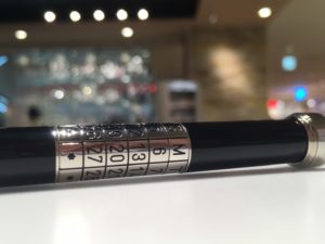 こちらはお客様からお預かりしましたカルティエのボールペンで、胴軸の部分には万年カレンダー、尻軸の部分には時計が付いている一石三鳥のボールペンです。