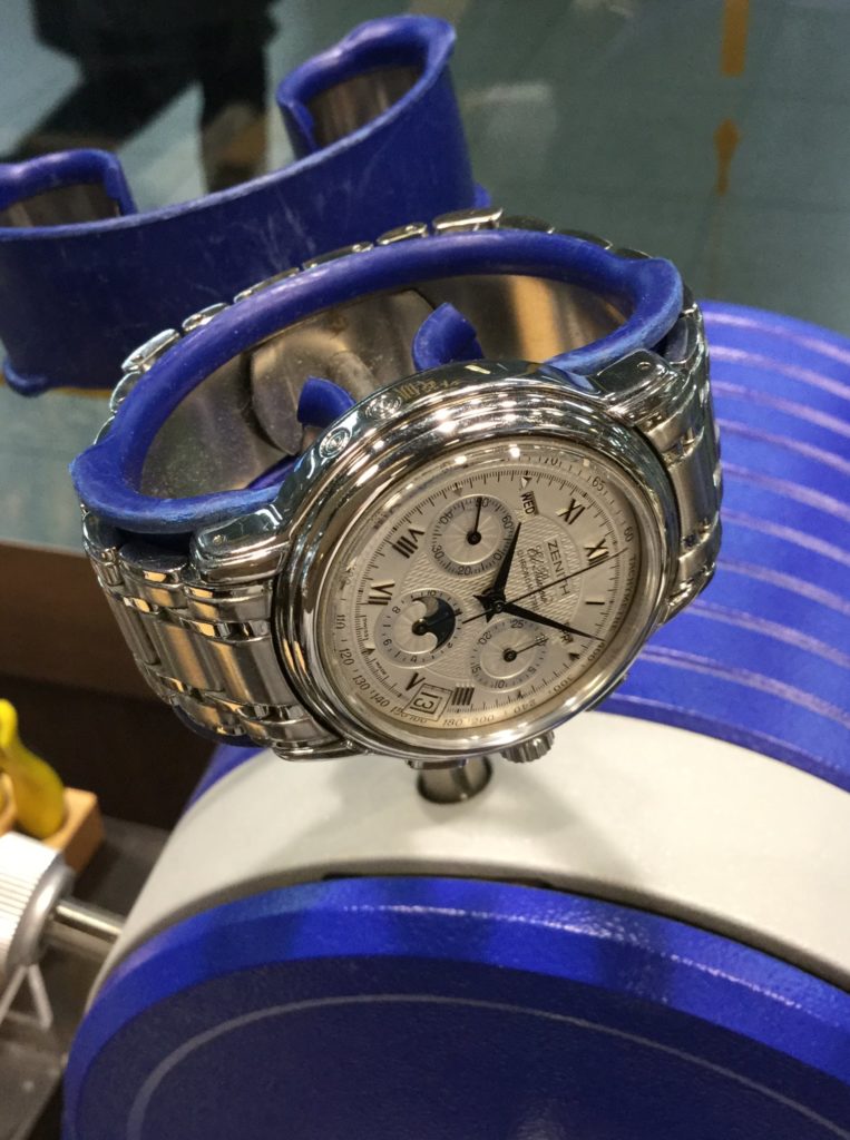 愛好家ならば、誰もが知るところの傑作クロノグラフ・ムーヴメント“エルプリメロ”。その“エルプリメロ”を搭載したこちら。トリプルカレンダーにムーンフェイズを備え、シルバーのギョウシェ彫り文字板と、ガジェット好きの琴線をこれでもかと擽ります。 デザインはクラシカルとも言えますが、どことなく近未来的でもある妖艶な輝き。惜しくも生産終了となりましたが、当時のデザインモデルは、今も根強い愛好家が大勢いらっしゃるそうです。