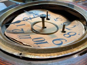 今回お預りしたお時計は愛知時計というクロックになります。 ラベルのデザインから明治25~29年に製造された時計で腕時計と比べるとかなり大きいことがわかります! お預かりした時にクモが出てきたのでムーブメントの状況もかなり悪そうです。 末長く使っていただけるようしっかりとメンテナンスさせていただきますので、今しばらくお待ち下さいませ。