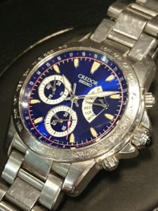 文字板は、言わずと知れた“サムライブルー”、独特の針配置と相俟って、実に美しいデザインとなっております。