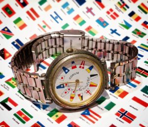 今回お持ち込みいただいたのはコルムの国旗をモチーフにした時計です。
