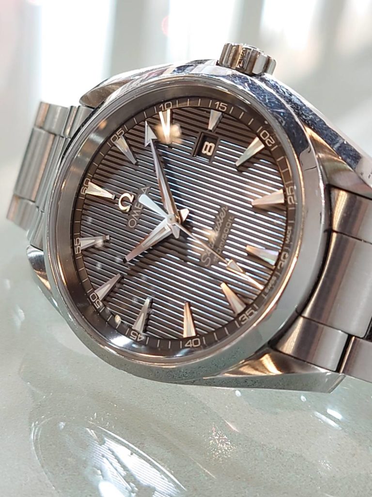 この度承りましたこちらは、オメガを代表するコレクション“シーマスター”の中でも、シンプルなデザインが人気のアクアテラでございます。