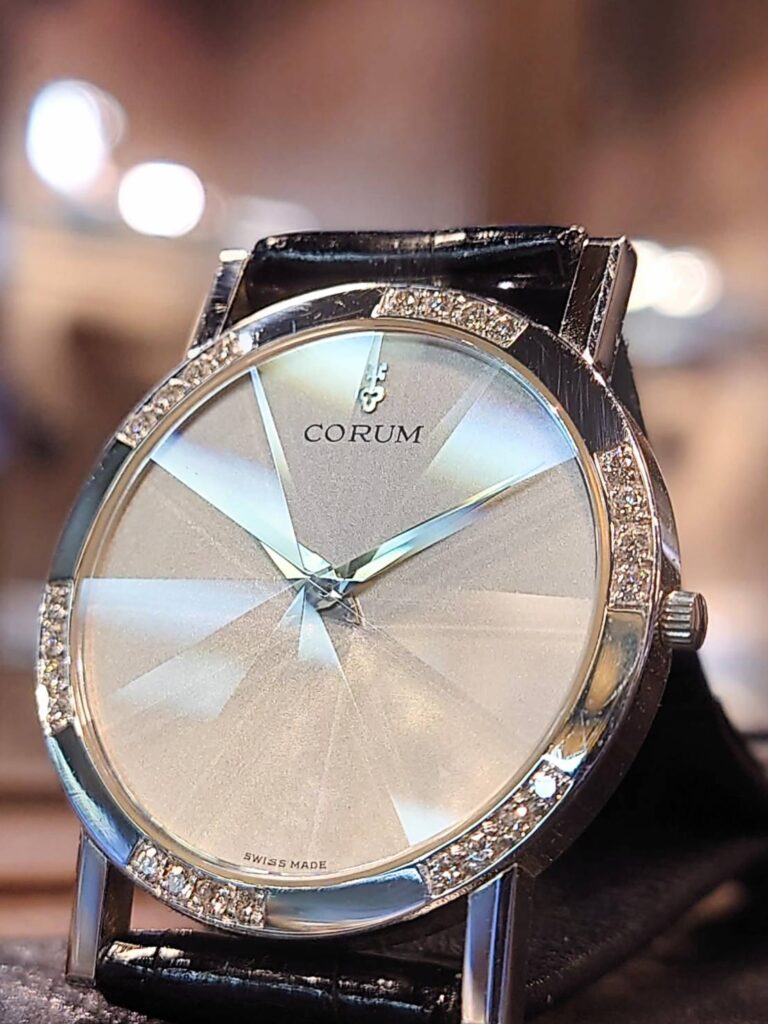 “CORUM”とはラテン語の“QUORUM”(会議で多数の賛辞を得るという意味)を、英語風にアレンジしたもので、シンボルマークの鍵は「完全な時への鍵」(KEY TO PERFECT TIME)を象徴したもの。