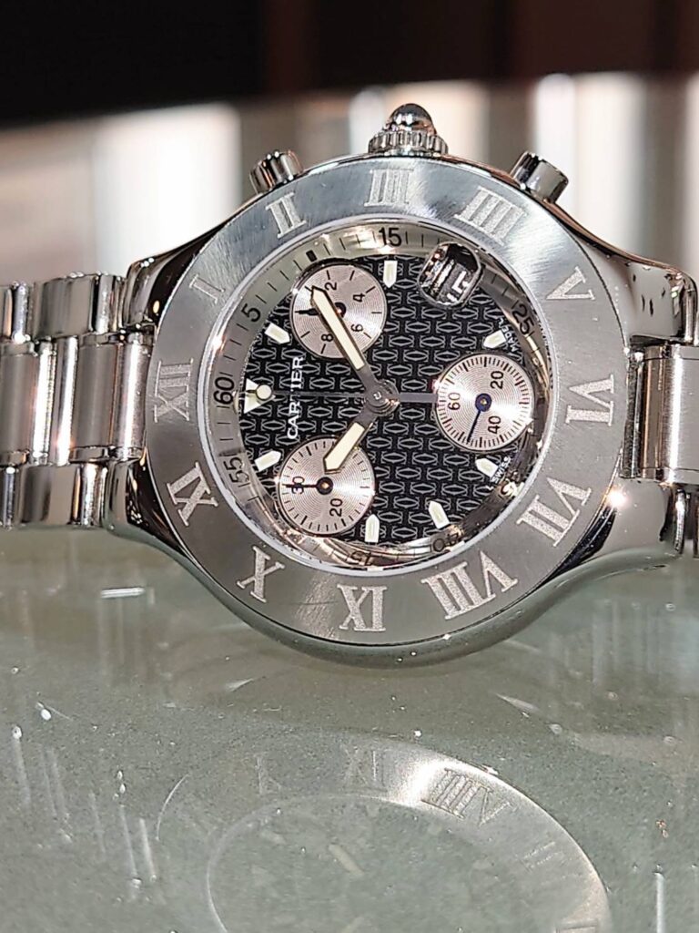 クラシカルなデザインが多いカルティエの中では、シャープでスポーティーなモデルに仕上がっております。