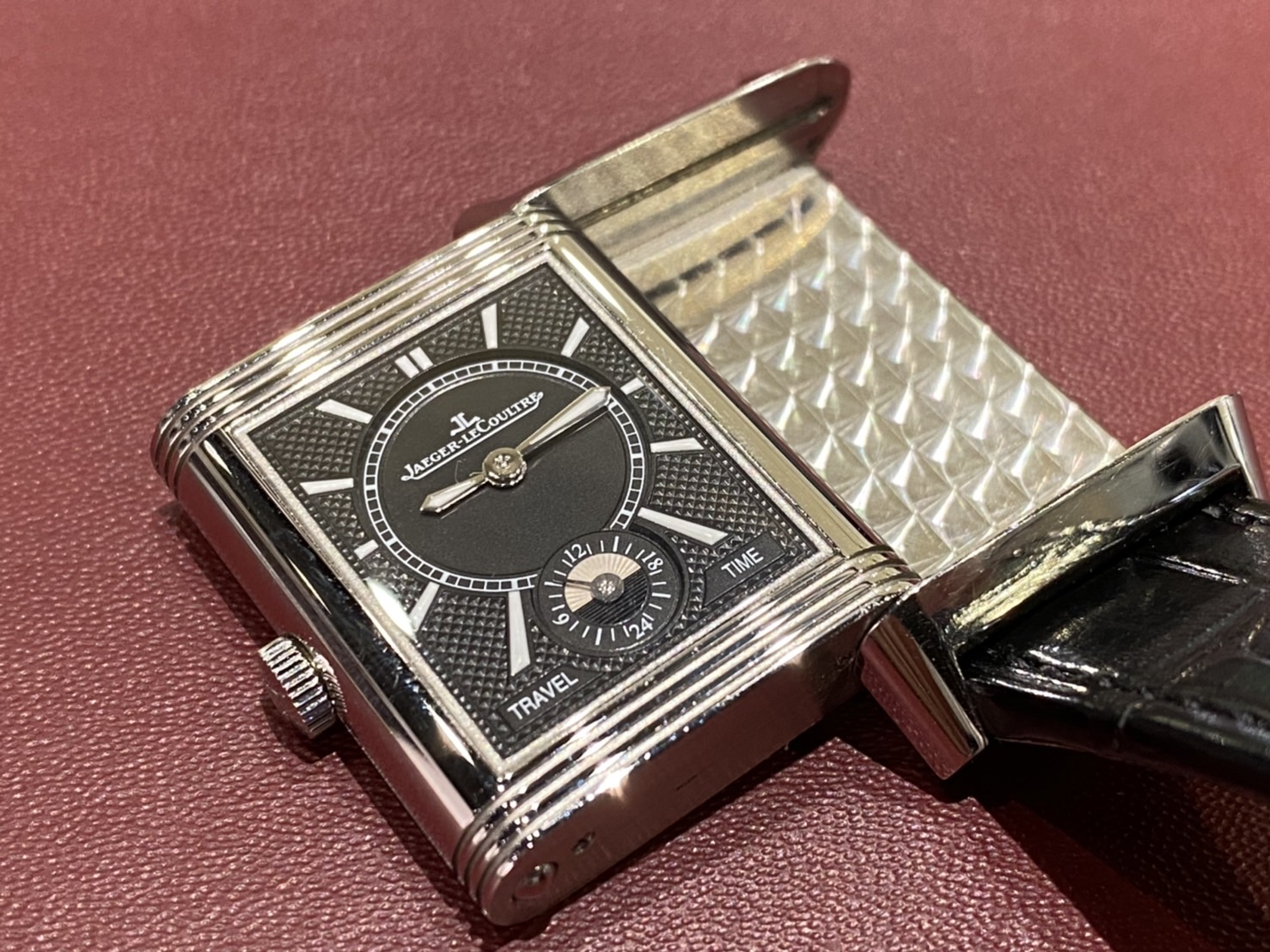 今回こちらのジャガー・ルクルト レベルソのお時計をオーバーホールでお預かり致しました! レベルソとはラテン語で「回転させる」という意味で、文字板が裏表にあり回転させることが出来るとても特徴的なお時計です! 製造のきっかけは腕時計をつけながらポロ(馬に乗って行う団体球技)をプレイする際に、ケースが壊れることがあると相談を受け、ケースを反転し金属面を表に出来る腕時計の開発を始めたそうです! 最近では風防はプラスチックではなくサファイアクリスタルに変わるなど丈夫になり、現代ではこのお時計のようにケース両面に文字板があるデザインも登場しているようです!