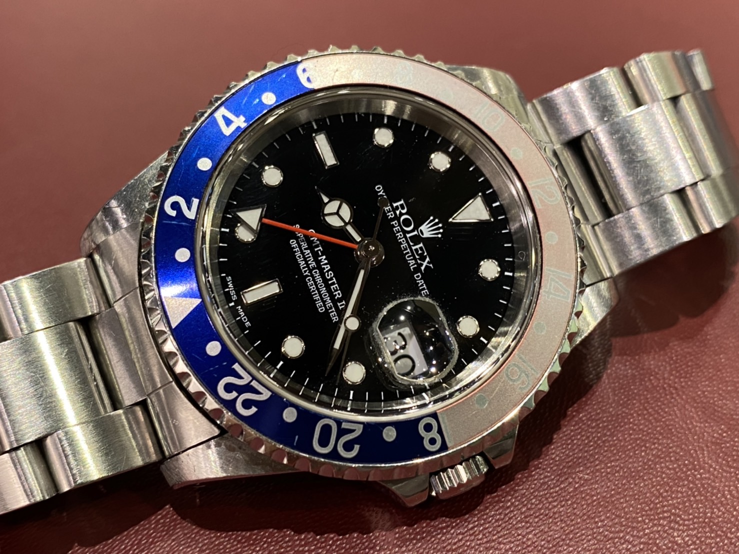 ロレックス GMTマスターⅡをお預り致しました。 1955年から生産されているGMTマスターはパンアメリカン航空(パンナム)からの依頼から開発が行われたのが始まりでした。 ベゼルの落ち着いたブルーがスポーティながらエレガントさを醸し出しています。
