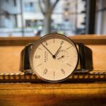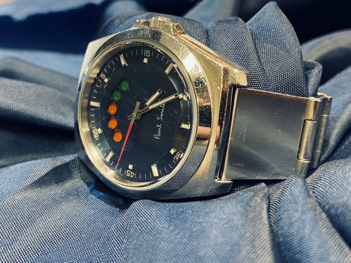 今回お預かりさせて頂いたお時計はポール・スミスになります。 文字盤に5つ空いている穴は一秒ごとに少しづつ回転するディスクにより様々な色を覗かせ見飽きることのないデザインになっています。