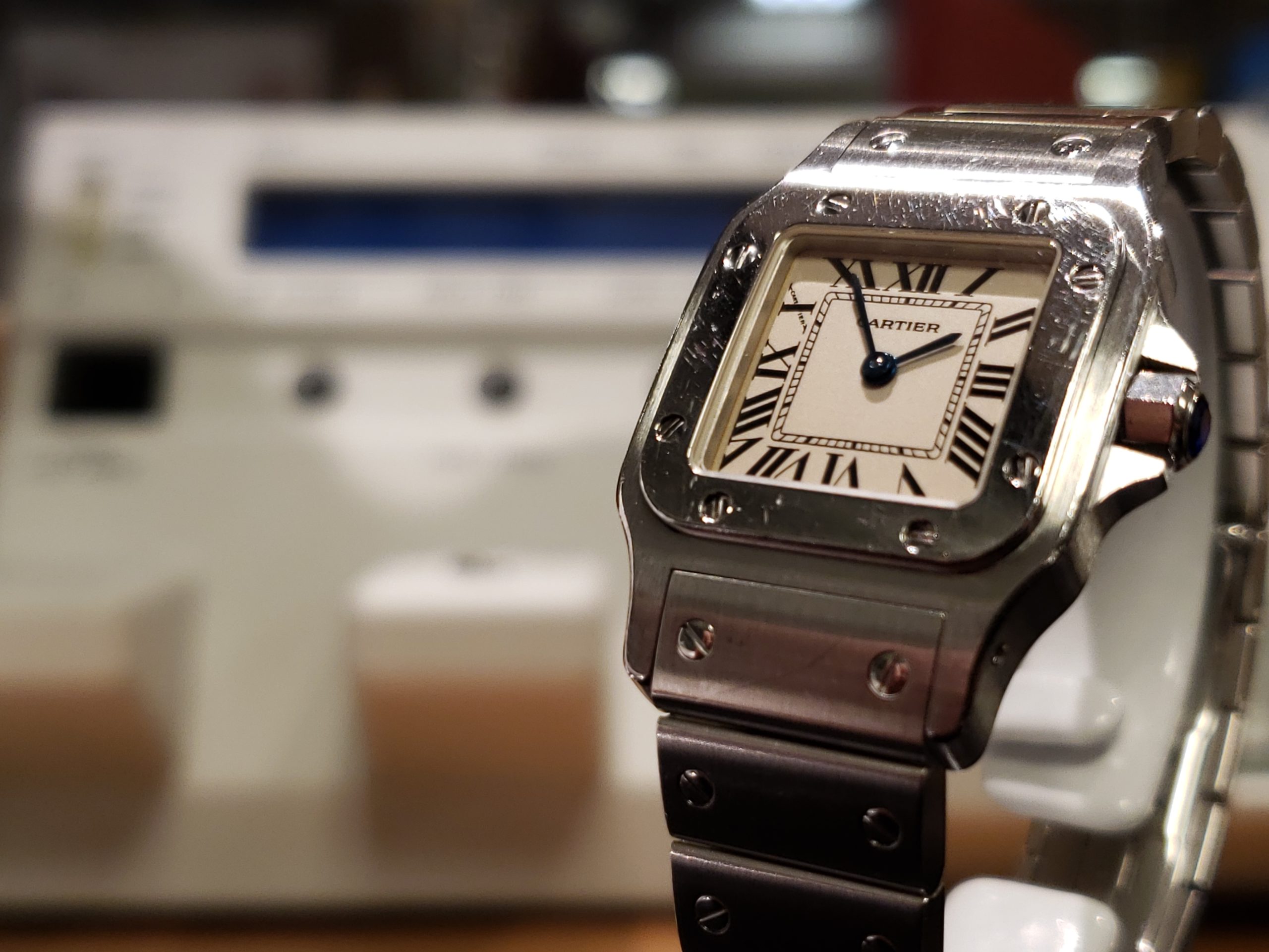 カルティエ サントスでございます。 15年程ご使用のお品をメンテナンスのためお預かり致しました。