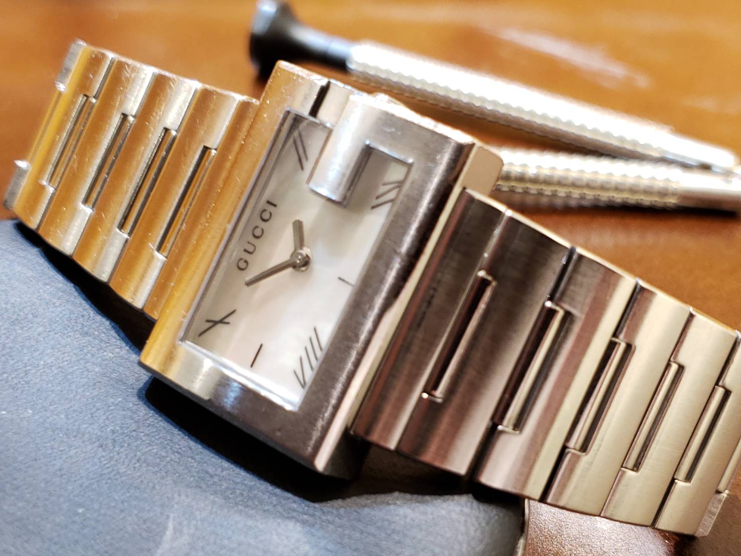 グッチ クォーツウォッチでございます。 ベゼルがGをモチーフにしたユニークなデザインです! 文字盤はシェル文字盤で、見る角度により表情が変わり、見ていて飽きることがありませんね。
