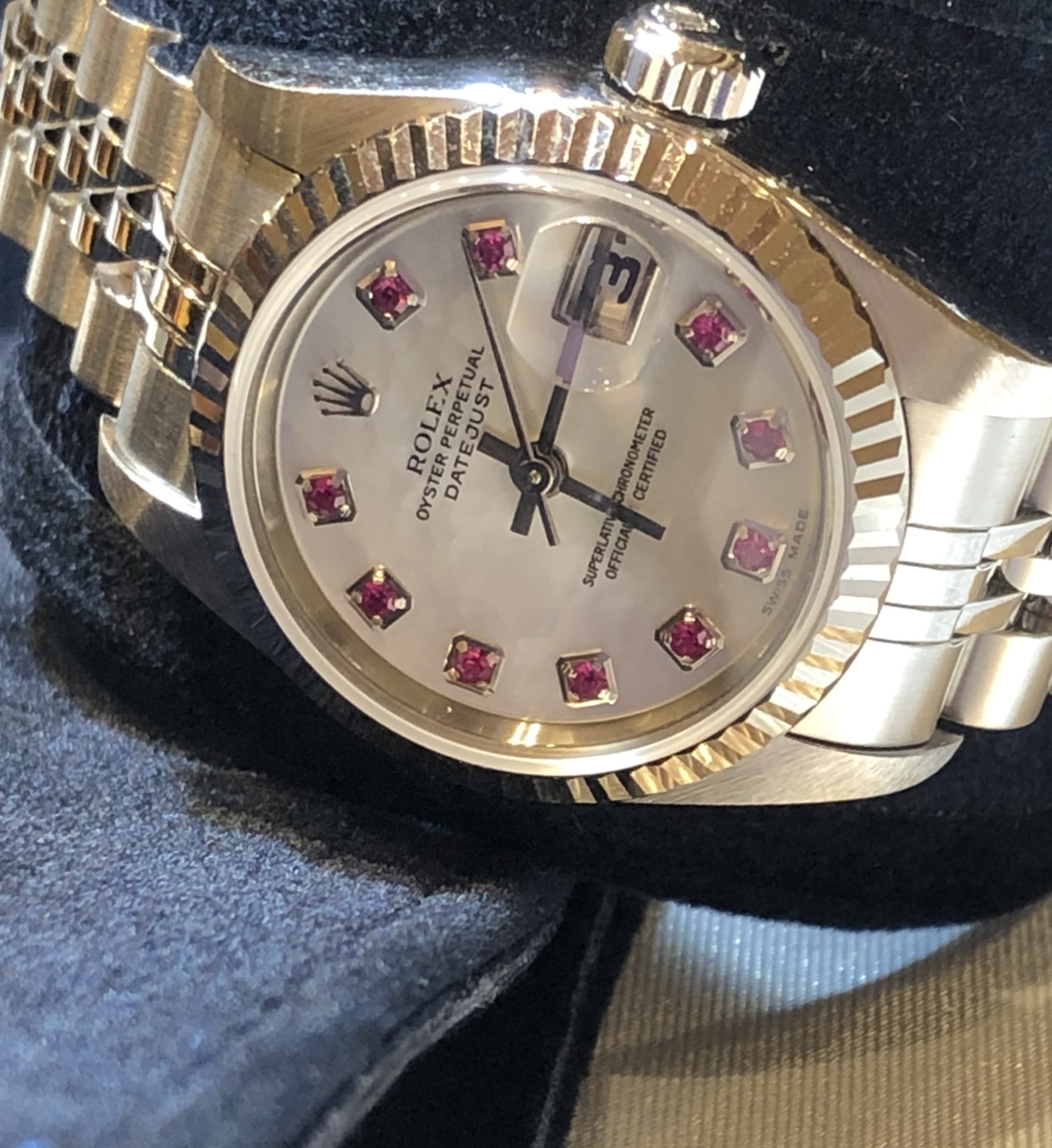 ロレックスのお修理やオーバーホールはたくさんご依頼いただいており、日々たくさんのモデルを目にしますが、今回のこちらも大変美しい逸品でございました。 文字盤は写真ではわかりづらいかもしれませんが淡いピンクがかったシェルになっており、 インデックスがこちらはルビーでしょうか?美しい優しくも高貴な色をたたえています。