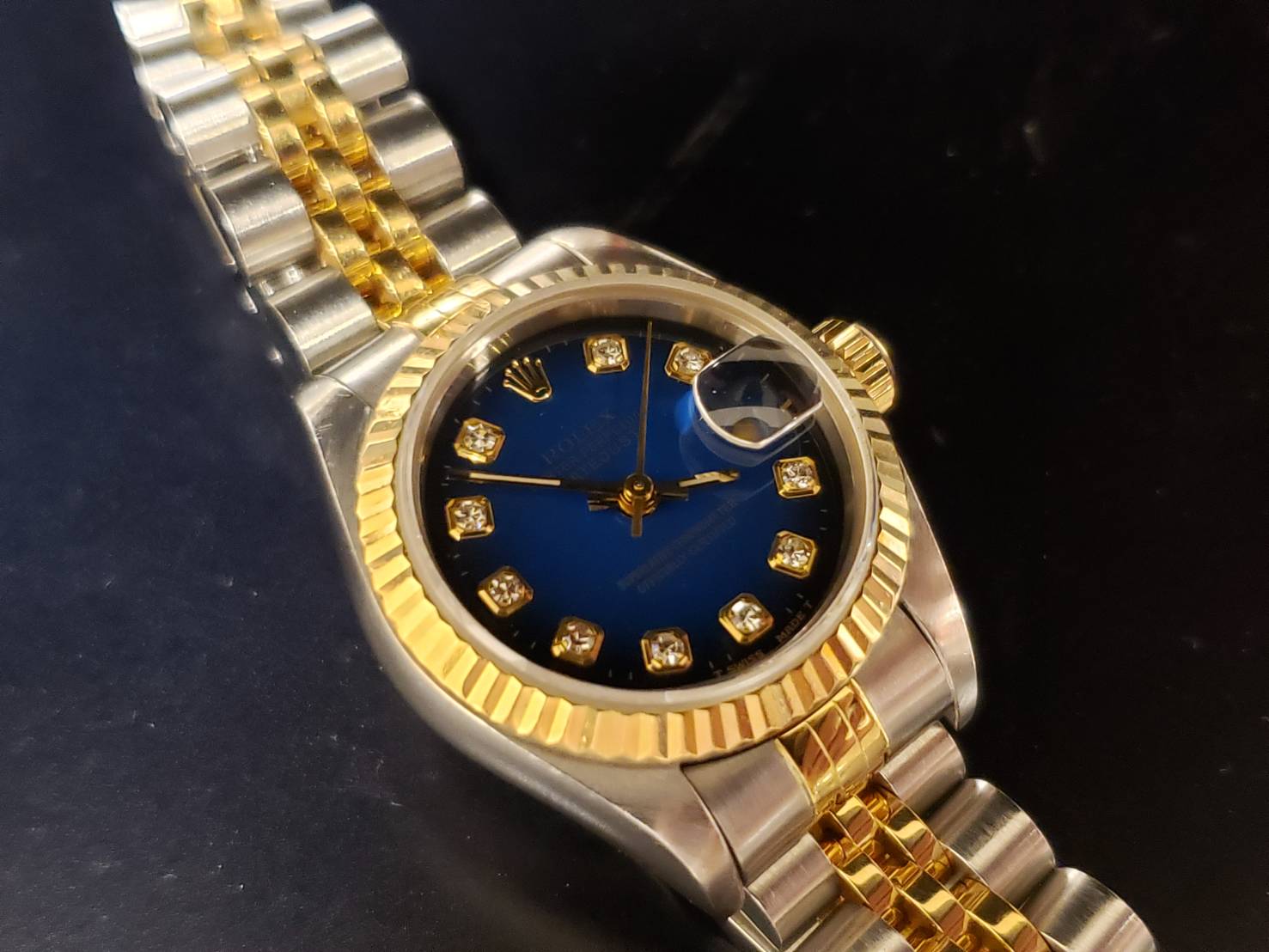 ロレックス デイトジャストでございます。 コンビケースと、深みのある紺色の文字盤がとても美しく、気品を感じます。 こちらはリューズねじ込み不良でお預かりし、大工事の修理となりました。