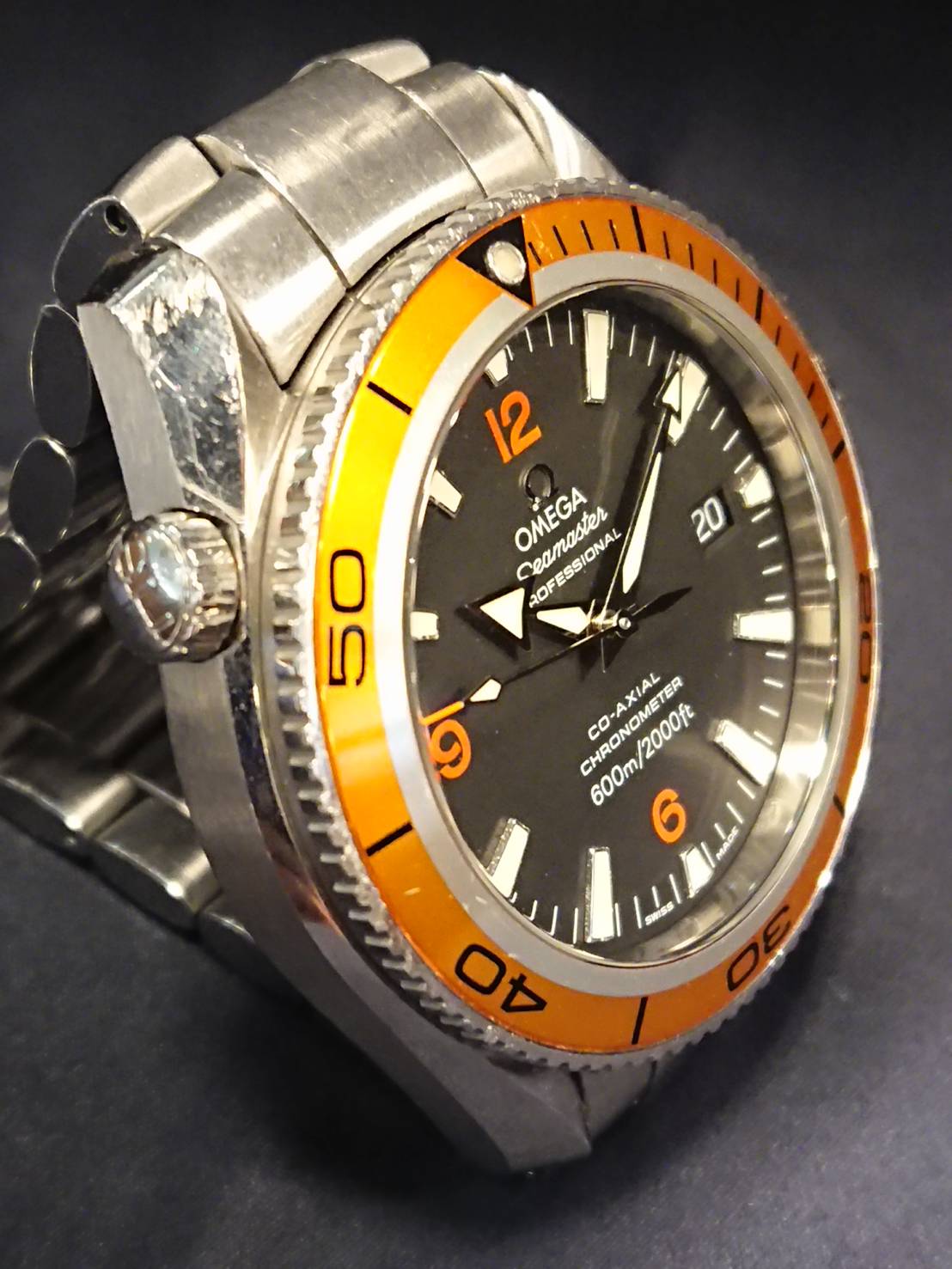 こちらは絶大な人気ダイバーズウォッチの、オメガ・シーマスターの中でも、一際突出した防水性を誇るプラネットオーシャン。 2005年に発表されて以来、オメガのダイバーズウォッチのフラッグシップモデルとしてもその名を馳せています。 通常のダイバーズモデルを遥かに上回る600m防水の堅牢性、オメガ独自の機構であるコーアクシャル脱進機を備え、毎秒7振動の独特のビート、何よりもヴィヴィッドなオレンジ色のベゼルにインデックス。 一目でそれと判るプラネットオーシャンは、オーナー様の並々ならぬ時計に対する気概が伺えます。