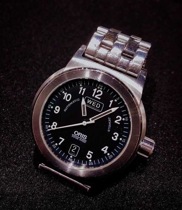 今回お預かりしたのはオリスの自動巻き時計です。 シンプルですが曜日の表示位置がほかの時計と変わっていていいですね。
