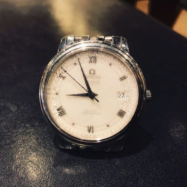 今回、OMEGAのオーバーホールを承りました。手を洗った際に時計に水が入り水滴が付いている状態です。ご来店いただいた際は湿気乾燥作業を希望されていたのですが、全く動いていない状態だったのと、購入年数を踏まえてオーバーホールをご提案致しました。水が入った状態でそのままにしておくと、内部のパーツがサビてしまうので、いち早くメンテナンスすることをお勧めいたします!