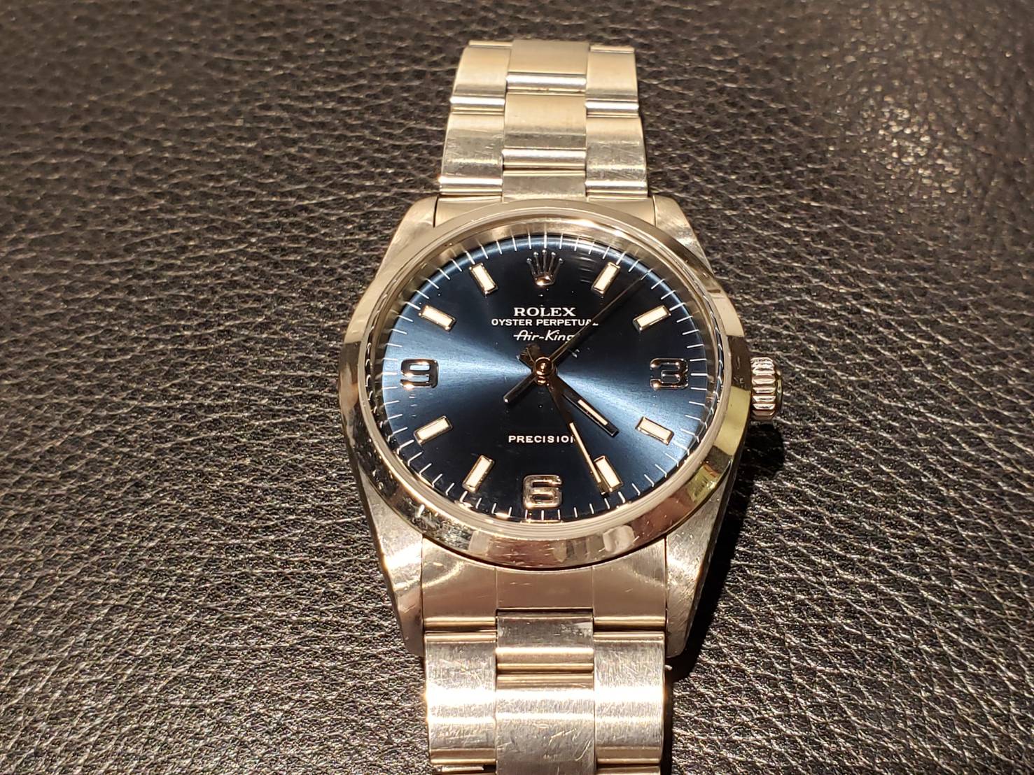 ロレックス エアキングでございます。 ロレックスのエントリーモデル的位置付けのエアキング。 デイトのないシンプルなスタイルですが、そのシンプルさが少し小振りな本体とよく似あい、とてもカッコいいですね。