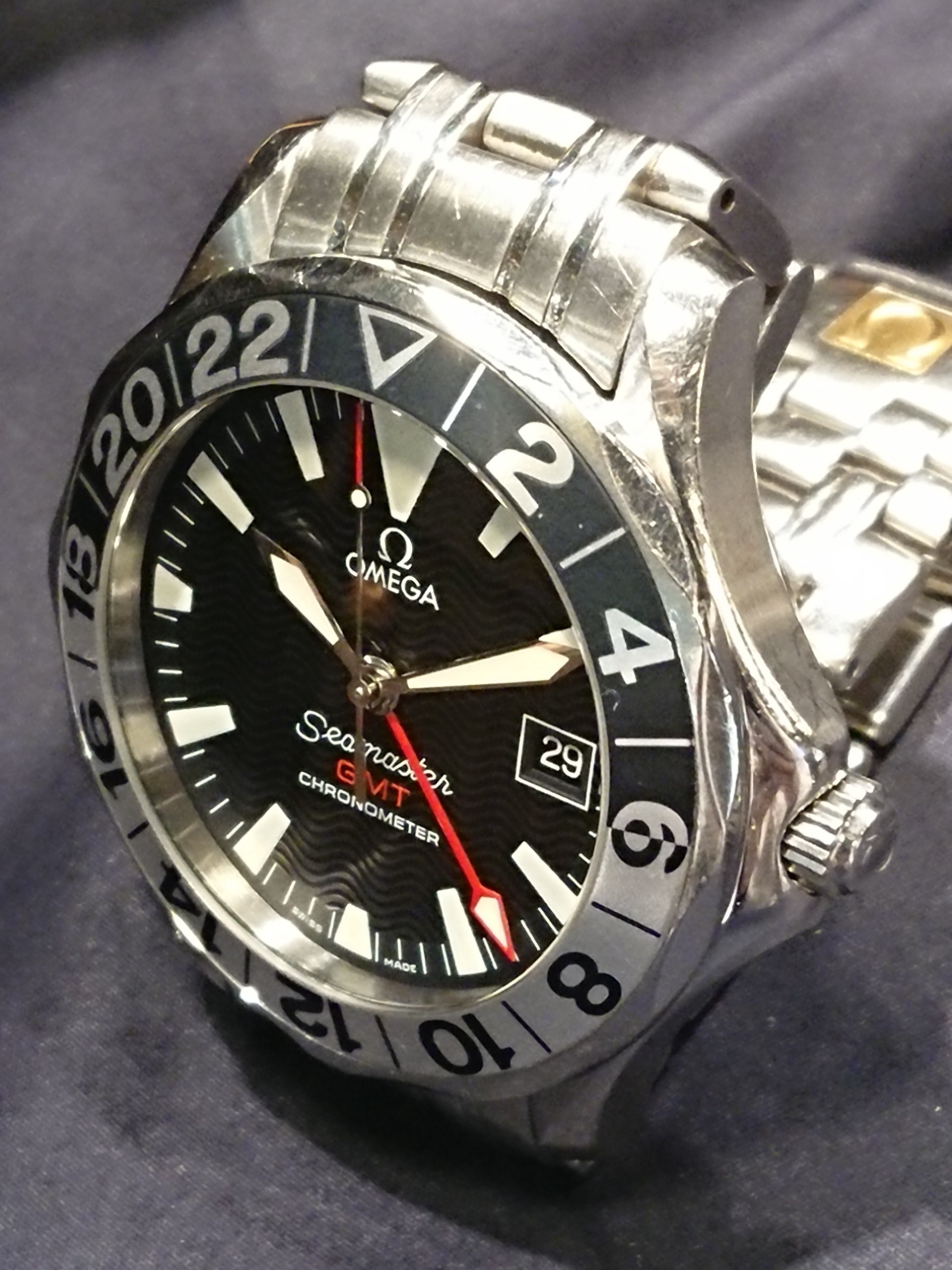 オメガの中でも、スピードマスターと双璧をなす人気スポーツモデル、シーマスター。 そのシーマスターでも一味違います。1998年に発売された、シーマスター50周年限定モデルで、シーマスターで初めてGMT機能を搭載しました。GMT針と回転ベゼルを利用して、第三時間帯まで同時に確認できる逸品です。