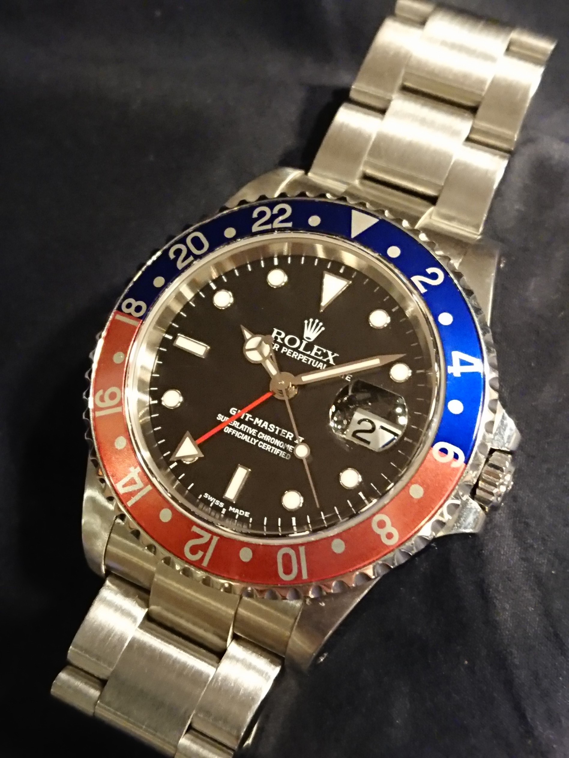 ロレックス不動の人気モデル、GMTマスターです。こちらは惜しくも2007年に生産終了となったモデル。ブラック一色の、セラクロムベゼルを備えたRef.116710が登場するまでロングセラーとなったモデルです。 その中でも絶大な人気の、赤×青ベゼルです。1955年に誕生したこのモデルは、回転ベゼルと24時間針とで、他の地域の時間を読み取ることを可能にしました。因みに、この特徴的な赤×青ベゼルは、赤が昼、青が夜と直感的に昼夜が判るように色付けられたものだそうです。