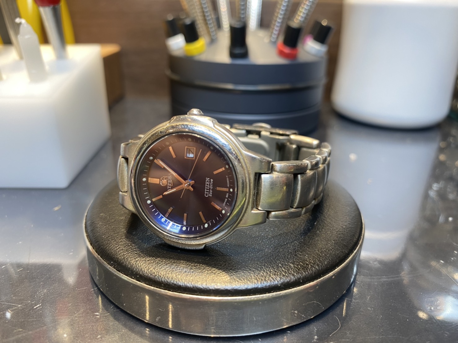 今回ご紹介する時計はシチズンのアテッサの腕時計です。 アテッサの主な特徴は、表面加工技術デュラテクトを用いたチタン製であること、摩擦がなく傷がつきにくいことで人気です。