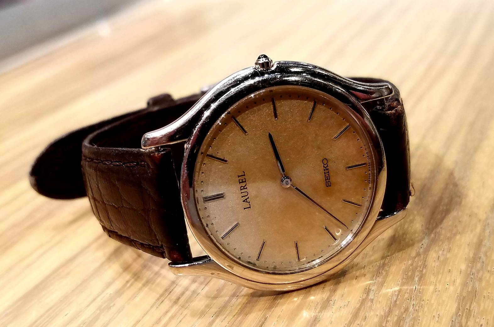 今回お預かりした品物はSEIKO LAUREL です。 日本で初めて製造販売された腕時計がこのセイコーローレルです。 1913年(大正2年)発売されおよそ100年前になります。 ケース文字盤共にゴールド色でベルトがダークブラウンと大人の雰囲気が漂うアンティークな時計です。 これからもご愛用いただけますように精一杯施術させて頂きます。お手元に届くまで今しばらくお待ちくださいませ。