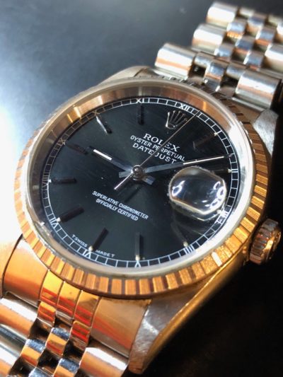 今回お持込み頂いた時計はスイスの腕時計メーカーであるROLEXの時計です。 ROLEXの定番であるデイトジャストのステンレスモデルです。 ブランドのロゴであるロレックスクラウンがリューズと文字盤に刻まれており、黒字に白色で控えめに書かれたローマ数字の文字盤がとてもオシャレでかっこいいです!