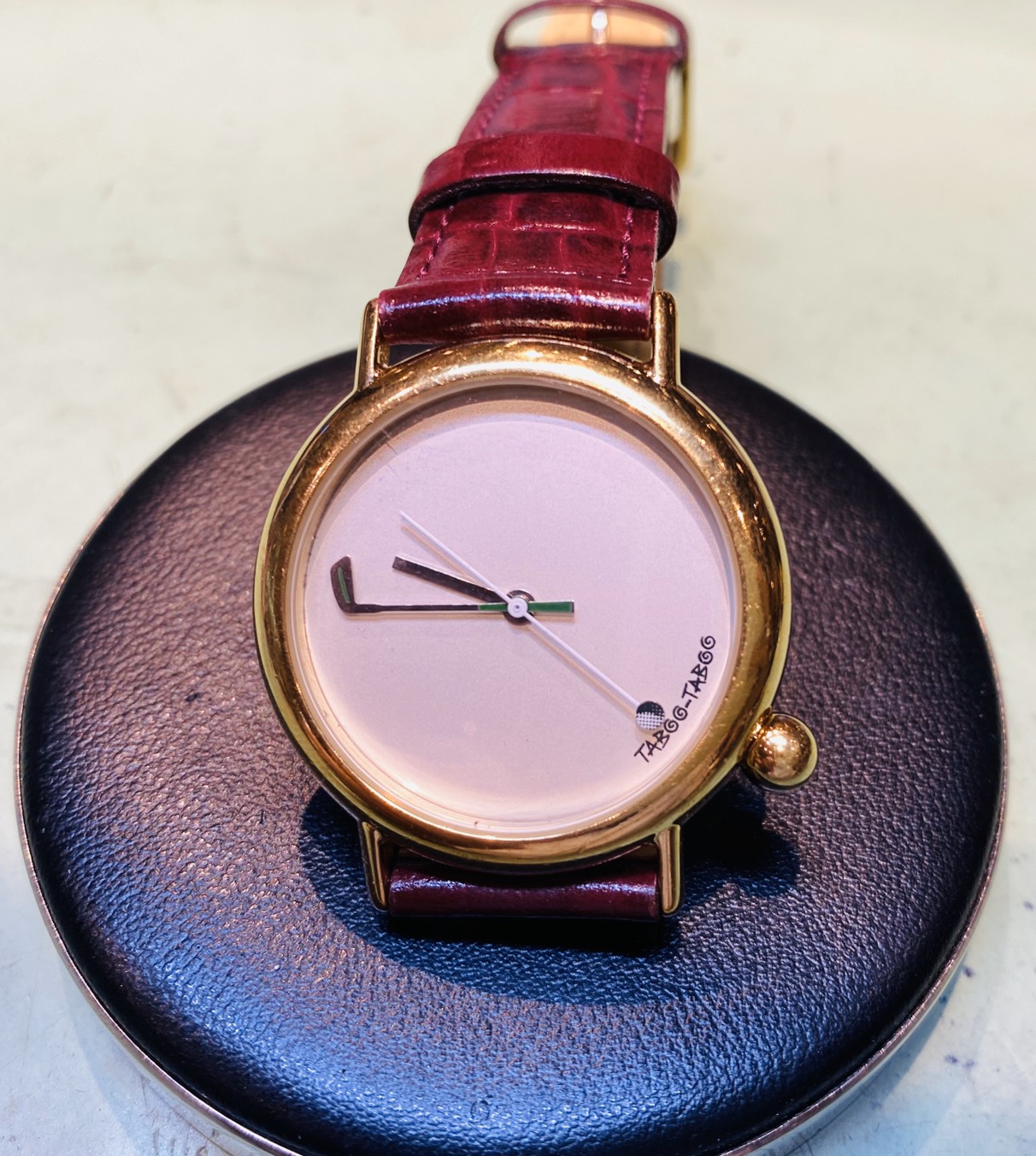 今回お預りする品物はTABOO TABOOの腕時計です。 TABOO TABOOの時計は遊び心があるデザインが多く、今回の時計は【ゴルフ】をテーマにしており、分針がゴルフクラブ、秒針がボールになっていてとてもお茶目なデザインです。
