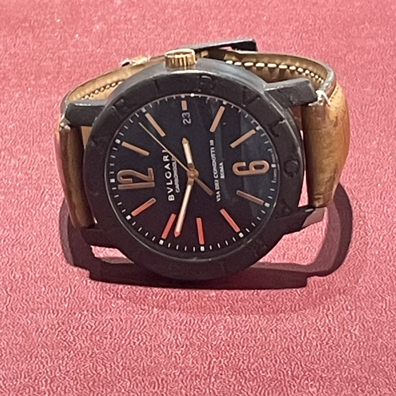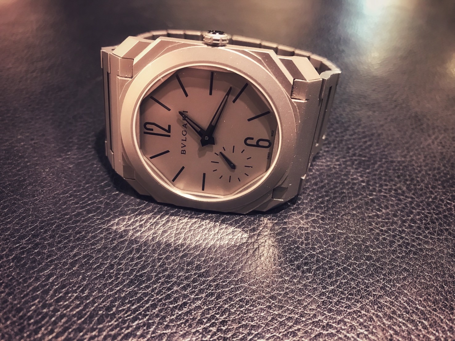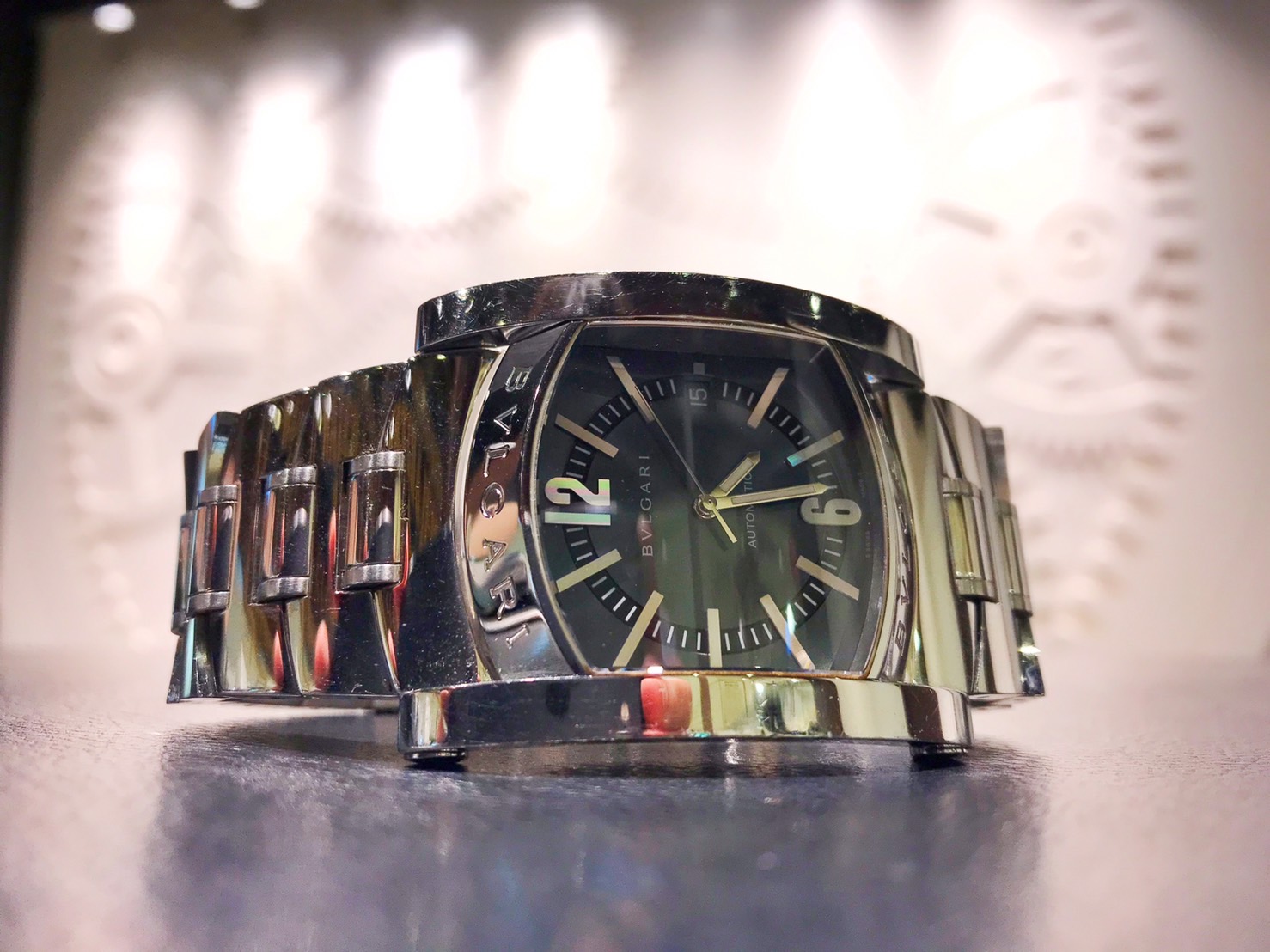 今回こちらのお時計を承りました! こちらのお時計はブルガリ アショーマというモデルになります。イタリア語で「主張」という意味を持ち、名前に劣らず、個性的なデザインのモデルになります。メンズモデルは重厚感があり、とてもかっこいいです!