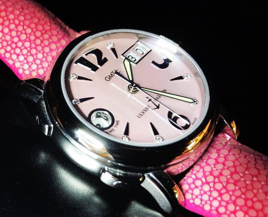 ユリスナルダンのオーバーホール、ベルト交換、ポリッシュ、ガラスコーティングといったトータルメンテナンスでお承り致しました。ベルトはお客様のご要望にお応えし、ピンク色のガルーシャベルトを一からオリジナルで作成いたしました。