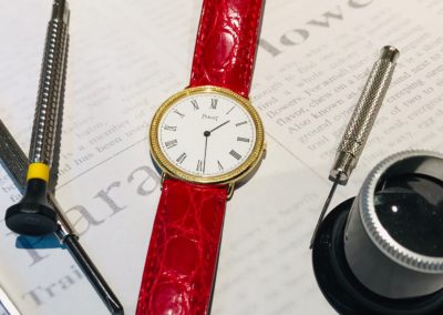 この度、オーバーホールをお承りましたピアジェの時計をご紹介致します。真っ赤なベルトが印象的なこちらのお品物。受け継がれているものだそうで、世代を超えても魅力溢れる時計です。 ピアジェの特徴は「薄型ムーブメントの開発に成功した点」です。それは、他社に先駆けたものでした。そのため、「薄型ムーブメントのお手本はピアジェ」という世間イメージがあります。現在でも、制作した極薄ムーブメントは多くの人々を魅了しています。