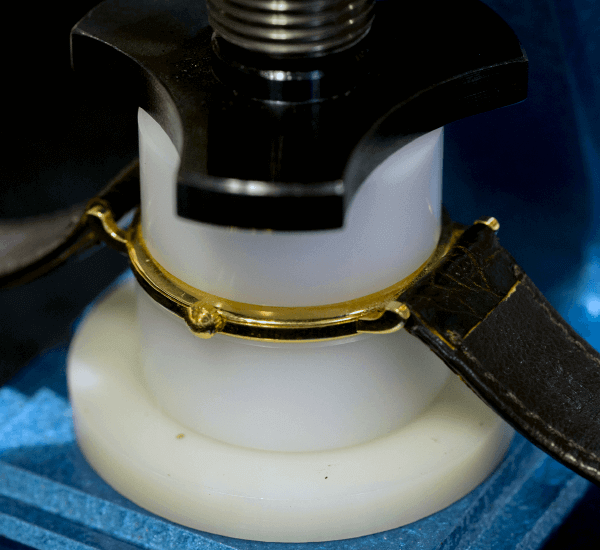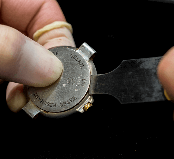 確実に電池をセットしたら時計の機械に汚れやゴミがないかチェックします。もし汚れやゴミがあれば、ロディコと呼ばれる専用の汚れ取りで丁寧に除去して行きます。必要があればパッキン交換を行い、裏蓋の閉めるべき方向をしっかりと確認してから、慎重に閉めます。