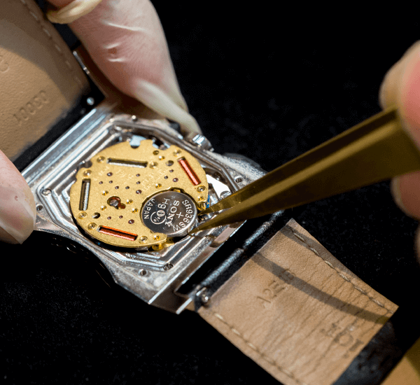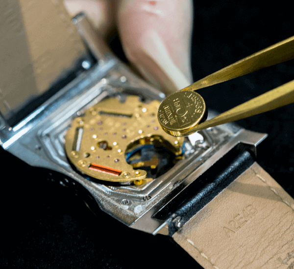 まずは裏蓋を開け、もともと入っている電池を取り出し電圧を測定いたします。そこで電圧が定格よりも減っているようであれば、新しい電池と交換します。後は内部のゴミや汚れを取り除き裏蓋を閉めます。動き出しているのを確認し、時刻合せ・カレンダー合わせを行い完成となります。
