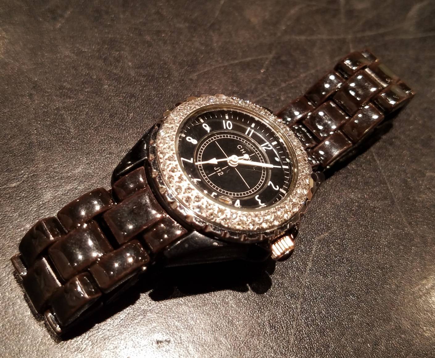 今回ご紹介する時計はシャネルの腕時計です。 シャネルは、化粧品、香水等展開しており女性に人気の高級ブランドです。ブラックで統一されていますが、ケース一周に輝くダイアモンドがシャネルならではの気品ある高級感が特徴の時計です。