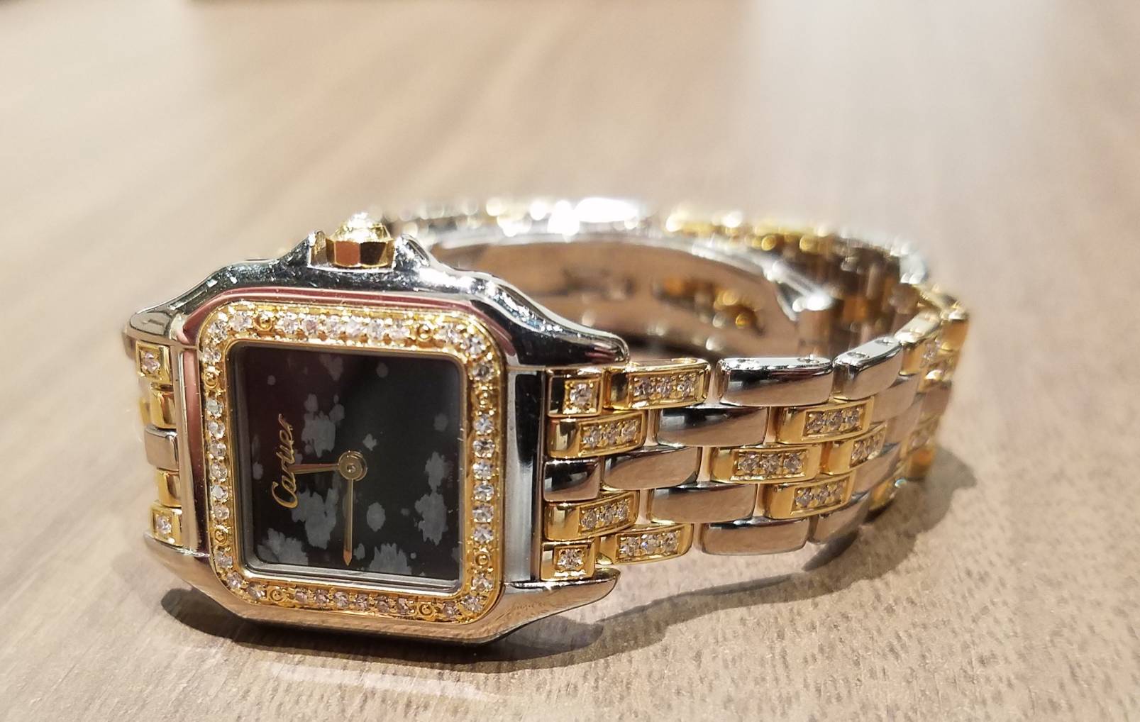 今回ご紹介する時計はカルティエの腕時計です。 お客様のお気に入りの時計らしく大切に使用されていたのが覗えるほどキレイな状態でした。 シルバーとゴールド色のコンビで華やかさがあり 尚且つ、ケース全体に石をあしらったエレガントさもある時計です。