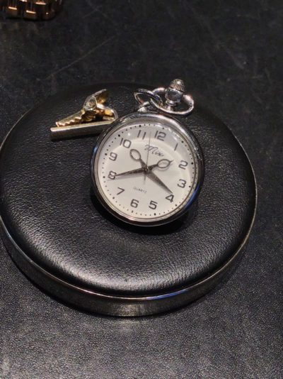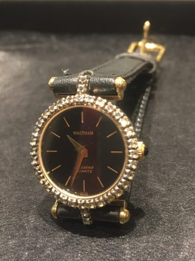 今回電池交換でお預りしました時計はウォルサムの腕時計です。 2針タイプの時計で、黒と金色がカッコよく、ベゼルには石が装飾されていて、とても上品でエレガントな腕時計です。