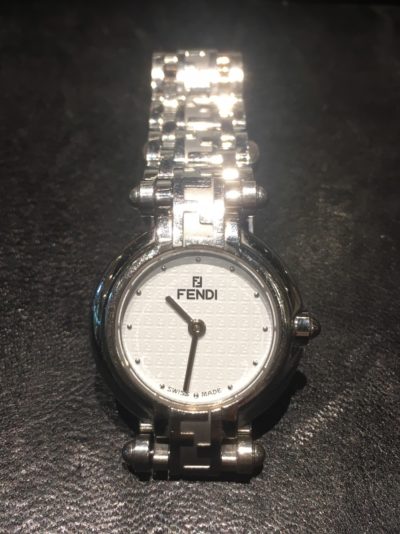 この度お持込みいただいた時計はフェンディの腕時計です。 一見シンプルな文字盤ですが、よく見るとフェンディのロゴマークが小さく無数にデザインされていてとてもオシャレな時計です。