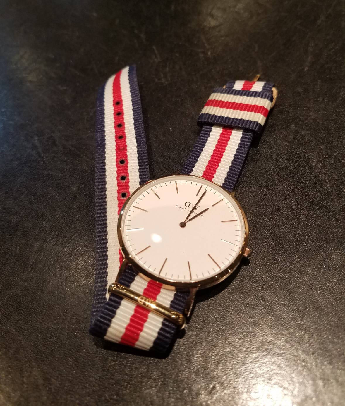今回お預りしました時計は 男女ともに人気のダニエルウェリントンの時計です。 ベルトは可愛らしいイギリス国旗色のデザインです!