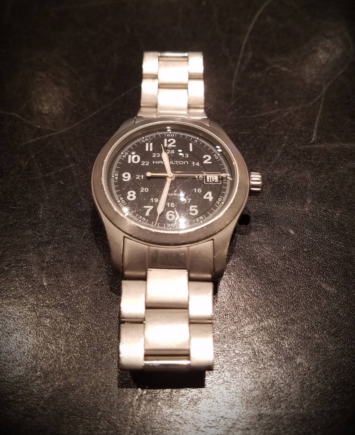 今回お預りした時計はハミルトン カーキの腕時計です。 電池交換でお預りしました。 ながく愛用している物だそうで、大切に施術します。