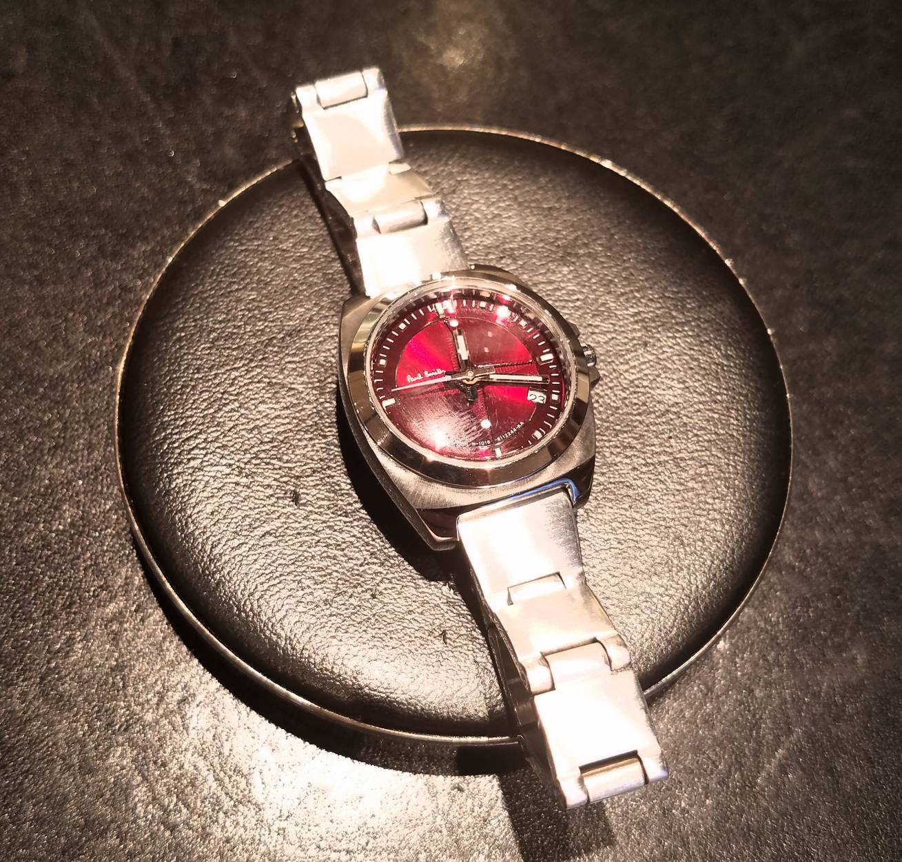 今回お持込み頂きました時計はポールスミスの腕時計です。 ケース、バンドはシルバーで文字盤がワインレッドとシックで大人の雰囲気のある時計です。 「ひねりの効いたクラシック」を定義にしているブランドらしい素敵なデザインです。