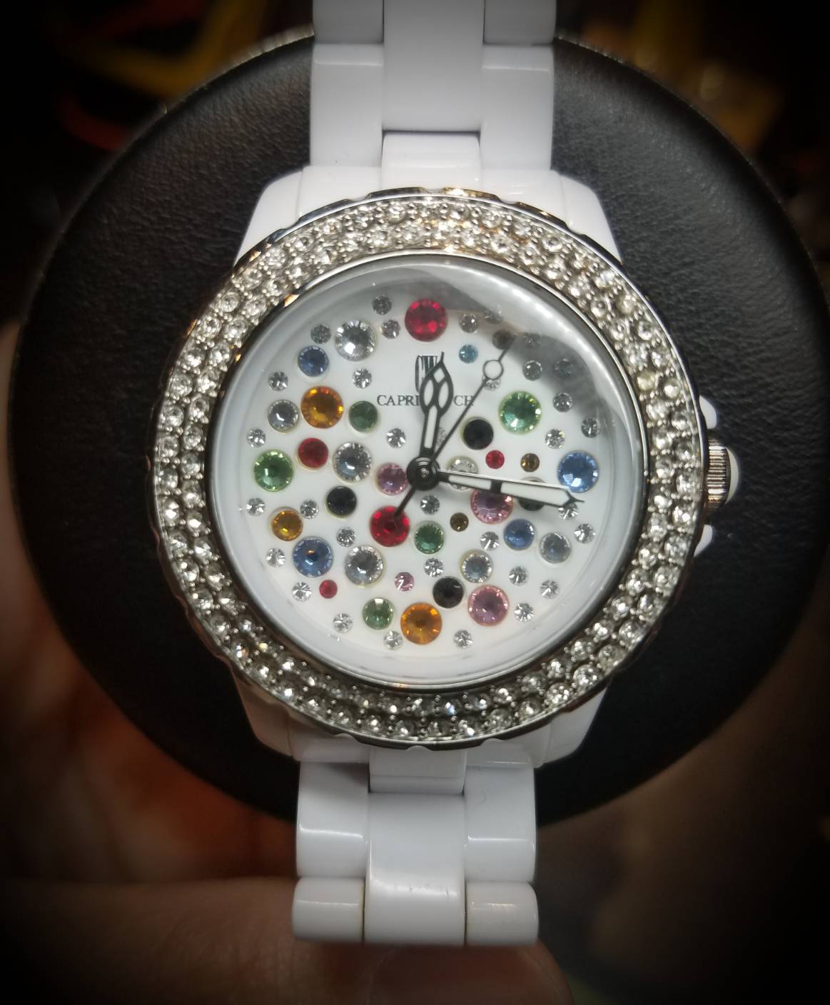 今回お預りしました時計はカプリウォッチのマルチジョイタイプの腕時計です。文字盤の中で輝く無数のスワロフスキーが印象的な女性に人気の時計です。 ケースから文字盤までホワイトのセラミック仕様な為よりいっそうキラキラと美しいフォルムです。