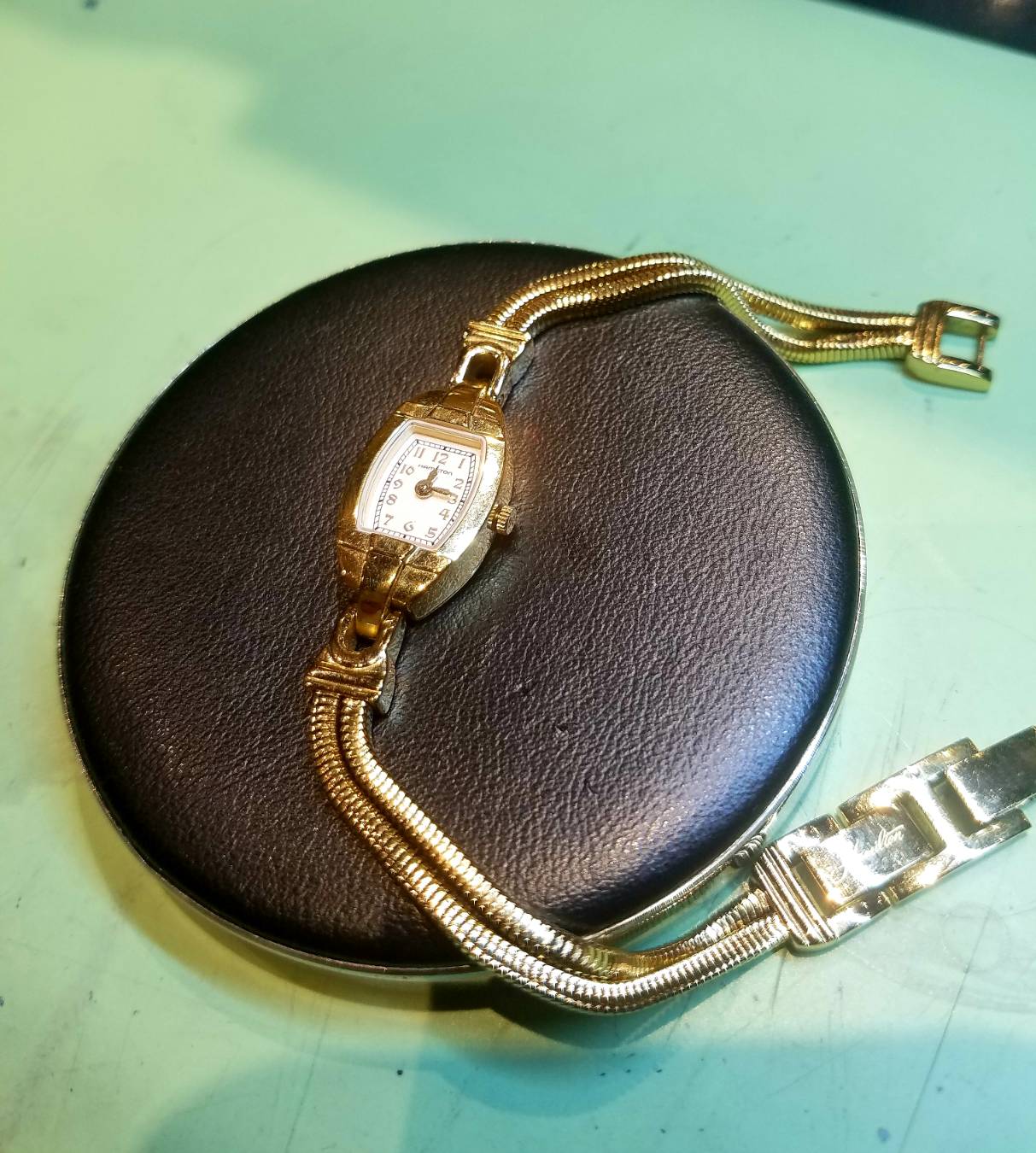 本日お預かりしました時計はハミルトンの腕時計です。 ケース、バンド共にゴールドで統一されておりサイズも小さすぎず大きすぎずの華奢な可愛らしい時計です。 また、バンド部分が珍しい仕様になっており締め付けがなく、付けいている感覚が無いほど体の一部としてご愛用頂ける時計になっています。