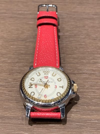 今回、当店にお持込み頂きましたお時計は、リトモラティノのお時計です。 電池交換でお預りしました。 お客様自身で、赤いベルトを購入されたお時計です。 とてもセンスがあり綺麗ですね。