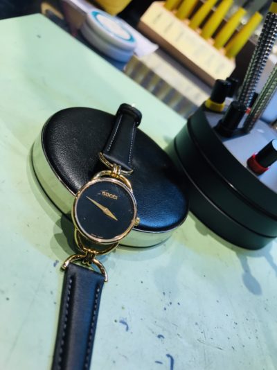 今回、当店にお持込み頂きましたお時計は、GUCCIのお時計です。シンプルな文字盤ですが、ケースとベルトの接続部分にデザインが有り素敵なお品物です。