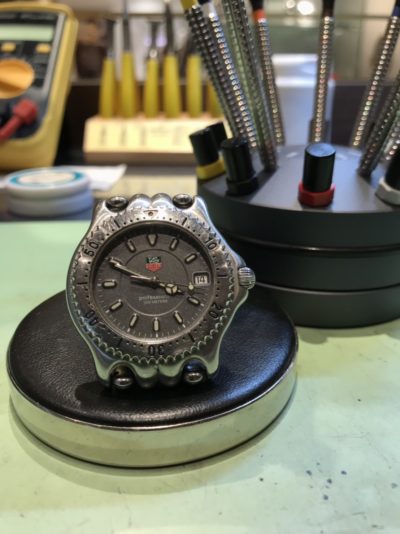 今回、当店にお持込み頂きましたお時計は、タグホイヤーのお時計です。グレー色の文字盤がカッコいい印象を引き立てます。