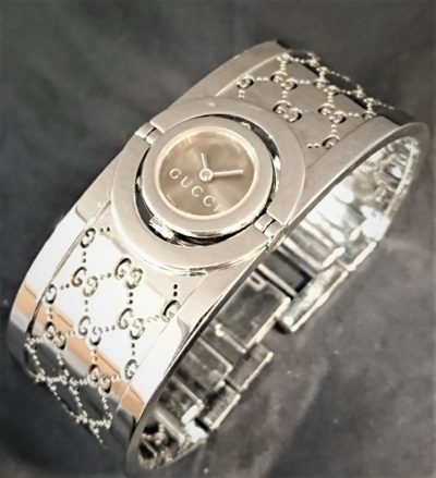グッチ・トワール 1921年、グッチオ・グッチがイタリアで創業した老舗ブランド。誰もが知るファッションブランドとして、今なお絶大な人気を誇ります。 また、ブランドの元祖ともいわれ、世界で初めて、創業者の名前を商品に入れたことでも有名でしょう。 バングルみたいなこちらのお時計、電池交換でお預かり致しました。