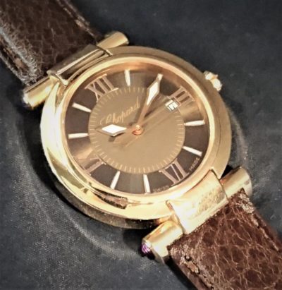 【ショパール・インペリアーレ・レディス】 高級腕時計の代名詞ともいえるブランドの一つ、ショパール。 この度お承りしたモデルは、“インペリアーレ” その優美なディテールが特徴のモデルです。洗練された美しさが感じられるローマインデックス文字盤には、剣を象った時分針がセットされています。 電池交換でお預かり致しました。