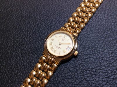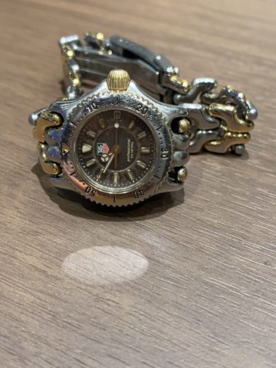 今回お預かりしました時計は、「タグ・ホイヤー」のSelレディースの電池交換です。 発売当時、金色と銀色のコンビネーションで独特の形状のベルト、スポーティなデザイン、サイズ感と日本人にとても合った感性で、爆発的にヒットした時計です。 この時計で、日本にタグホイヤーの名前が有名になったといっても過言ではないと思います。 現在は、廃盤になっている時計なので修理しても使いたいお持込み頂きました。